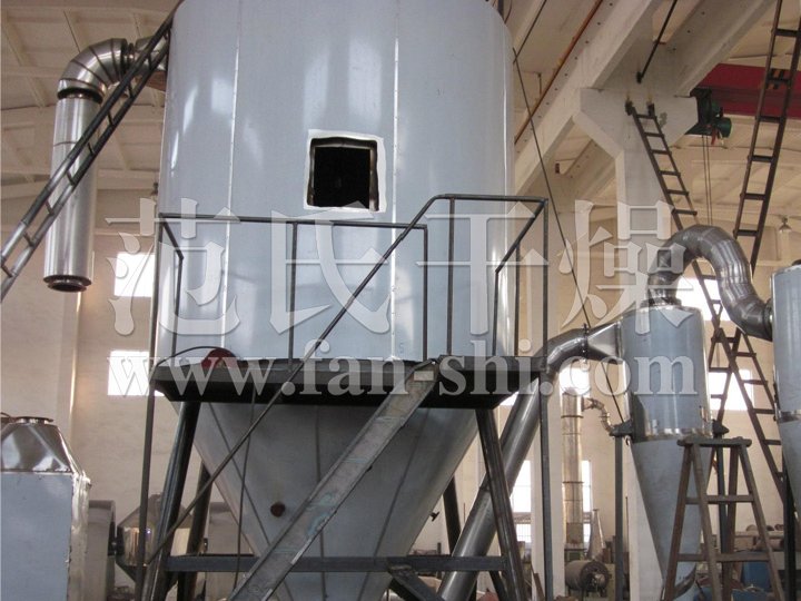 空气经过滤和加热,进入干燥器顶部空气分配器,热空气呈螺旋状均匀地进入干燥室。料液经塔体顶部的高速离心雾化器,(旋转)喷雾成极细微的雾状液珠,与热空气并流接触在极短的时间内可干燥为成品。成品连续地由干燥塔底部和旋风分离器中输出,废气由风机排空。