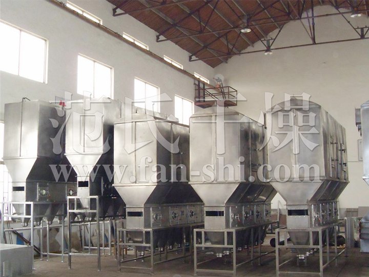 洁净的热风经阀板分配进入床体内,从加料器进入的湿物料被热风形成沸腾状态。由于热风与物料广泛接触,增强了传热传质的过程,因此在较短时间内就可干燥。如用连续型,物料从床体的一头进入,经过几十秒至几分钟沸腾干燥,自动从床体另一头流出。本设备一般进行负压操作。