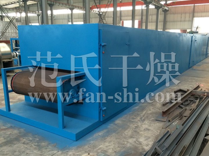物料由加料器均匀地铺在网带上,网带一般采用12-60目不锈钢丝网,由传动装置拖动在干燥机内移动。干燥机由若干单元组成,每一单元热风独立循环,部分尾气由专门排湿风机排出,废气由调节阀控制,热气由下往上或由上往下穿过铺满物料的网带完成热量与质量传递的进程,带走物料水份。网带缓慢移动,运行速度可根据物料温度自由调节,干燥后的成品连续落入收料器中。上下循环单元根据用户需要可灵活配备,单元数量亦可根据需要选取。
