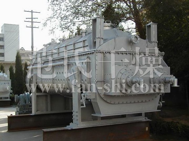空心轴上密集排列着楔型中空浆叶,热介质经空心轴流经浆叶。单位有效容积内传热面积很大,热介质温度从-40℃到320℃,可以是水蒸汽,也可以是液体型:如热水、导热油等。间接传导加热,没有携带空气带走热量,热量均用来加热物料。热量损失仅为通过器体保温层向环境的散热。楔型浆叶传热面具有自清洁功能。物料颗粒与楔型面的相对运动产生洗刷作用,能够洗刷掉楔型面上附着物料,使运转中一直保持着清洁的传热面。浆叶干燥机的壳体为Ω型,壳体内一般安排二到四根空心搅拌轴。壳体有密封端盖与上盖,防止物料粉尘外泄而充分发挥作用。