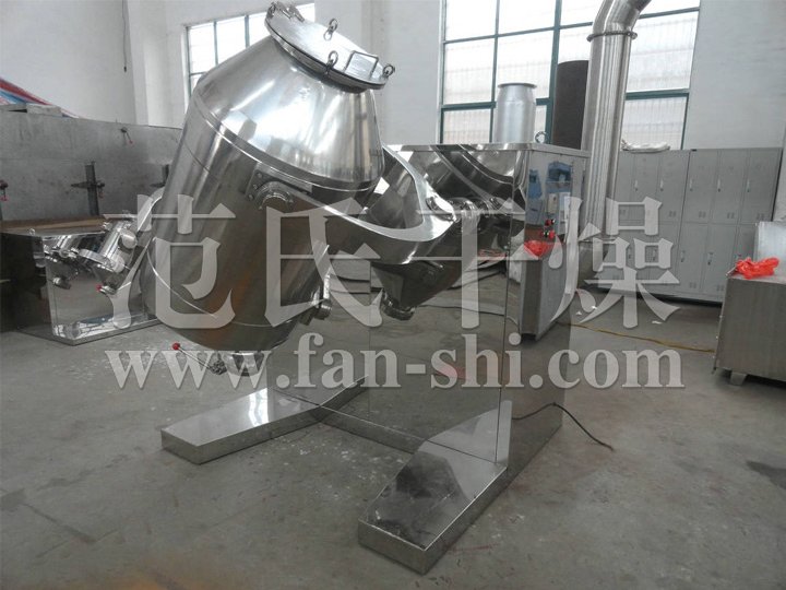 装料的筒体在主动轴的带动下,作周而复始的平移、转动和翻滚等复合运动,促使物料沿着筒体作三向复台运动,从而实现多种物料的互相流动、扩散、积聚、掺杂.以达到均匀混合的目的。