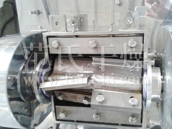 物料由进料斗送进粉碎室,经刀刃和刀座的冲击,旋转刀和固定刀同时剪切粉碎,由于受到旋转离心力的作用,物料自动从出口处流出。